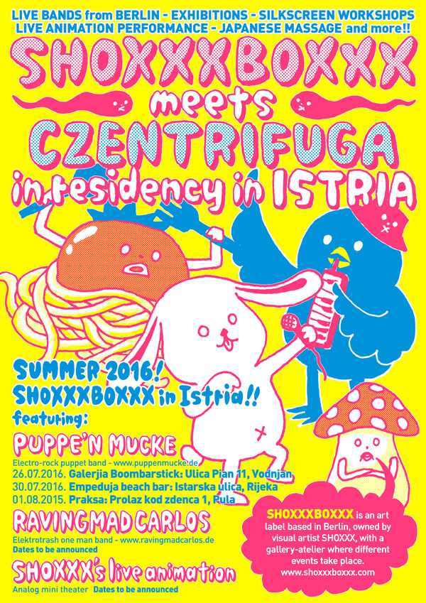 In summer 2016 Czentrifuga invited us (SHOXXXBOXXX) to come to a residency in Vodnjan, Istria peninsula in Croatia. Special thanks to: Marko (czentrifuga), Klara (Galerija Boombarstick)!! We are already super excited :-D